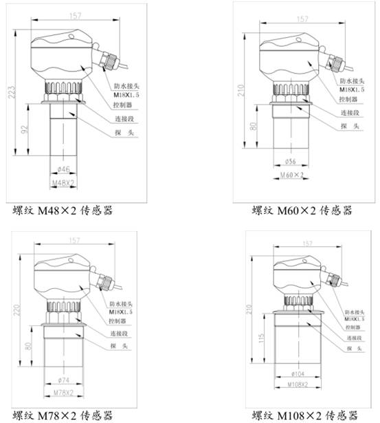 SKCYW系列超聲波液位計(jì) 超聲波液位計(jì)可采用二線制、三線制或四線制技術(shù),供電回路和信號(hào)輸出回路獨(dú)立,當(dāng)采用直流24v供電時(shí),可使用一根3芯電纜線,供電負(fù)端和信號(hào)輸出負(fù)端共用一根芯線;當(dāng)采用交流220v供電時(shí),或者當(dāng)采用直流24v供電,要求供電回路與信號(hào)輸出回路完全隔離時(shí),應(yīng)使用一根4芯電纜線。直流或交流供電,具有4~20mADC,高低位開(kāi)關(guān)量輸出。 超聲波液位計(jì)應(yīng)用: 1、測(cè)量流量、液位、低表壓、真空和比重 2、兩線制最大量程可達(dá)30m 3、四線制最大量程可達(dá)40m 4、最小分辨率1mm 5、LCD/LED大顯示屏 6、智能信號(hào)處理技術(shù) 7、配有高低位雙繼電器(僅四線制) 8、全塑料防腐外殼(防護(hù)等級(jí)lP67) 9、換能器結(jié)構(gòu)(小量程物位計(jì)法蘭安裝時(shí),對(duì)法蘭接管長(zhǎng)度無(wú)要求) 10、簡(jiǎn)單的按鍵設(shè)定參數(shù)(無(wú)需等待容器排空或加滿(mǎn),無(wú)需附加的遙控器) 11、靈活的安裝方式(螺紋/法蘭、固定孔/支架) 螺紋尺寸:M48*2 M60*2 超聲波液位計(jì)技術(shù)參數(shù)
